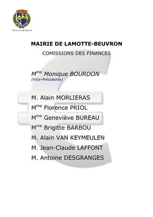 MAIRIE DE LAMOTTE-BEUVRON COMISSIONS DES FINANCES Mme Monique BOURDON (Vice-Présidente) M. Alain MORLIERAS Mme Florence PRIOL Mme Geneviève BUREAU Mme Brigitte BARBOU M. Alain VAN KEYMEULEN M. Jean-Claude LAFFONT M. Antoine DESGRANGES