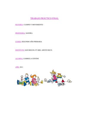 TRABAJO PRÀCTICO FINAL MATERIA: CUERPO Y MOVIMIENTO PROFESORA: SANDRA CURSO: SEGUNDO AÑO PRIMARIA INSTITUTO: SAN MIGUEL Nº 4008. AROYO SECO. ALUMNA: GABRIELA CENTINI AÑO: 2011